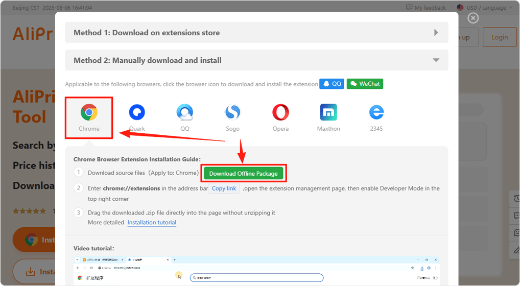 In this pop-up, click the Chrome browser icon, then click [Download Offline Package] to save the extension ZIP file to your computer. Or, click here  download offline package directly.