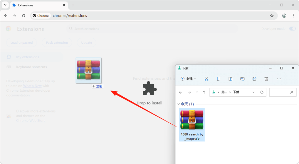 Once Developer mode is enabled, drag and drop the downloaded ZIP file (do not extract it) directly into the page. After installation, you can delete the original ZIP file; it will not affect the extension.