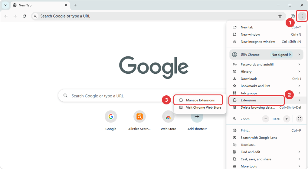 In the browser's top-right corner, click "" icon [Extensions] [Manage Extensions]